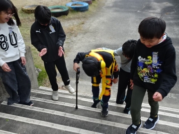 高齢者疑似体験では、サポーターやゴーグル、耳栓で高齢者の体の動かしにくさや、目の見づらさ、耳の聞こえにくさを体験しました。いつもは何気なく行っている階段の上り下りも体が動かしづらいととても大変な動きなのだと、体験を通して学んでいました。