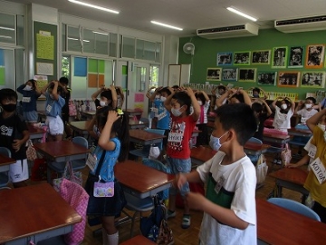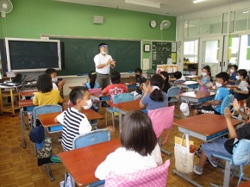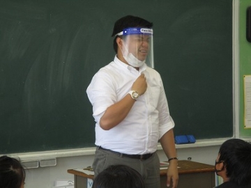 ジョン先生に英語のあいさつや発音を教えてもらっています。英語の発音は口の動きも重要になってくるので、学校からフェイスシールドを貸し出し、授業をしってもらいました。子どもたちはマスクをしているものの、ついつい大きな声で反応してしまいます。フェイスシールドもなく、遠慮なく声を出せる日までは、感染防止を心がけていきます。