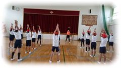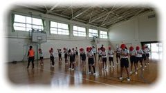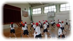 Queenの名曲に乗りながら,体の各部を伸ばしていきます。森内先生の体の動きについていこうと子どもたちも一生懸命です。でも,とても楽しそうです。