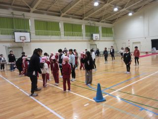 体育館では、6年生を送る会で発表する内容を3年生と一緒に「きしだこども園交流バージョン」にアレンジして、発表を見てもらいました。知っている歌を一緒に歌ってくれている子もいて、うれしく思いました。「ピラミッドじゃんけん」も一緒に楽しむことができました。
