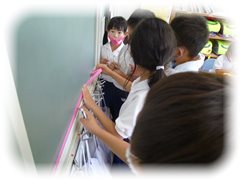 比べてみたいものとして,「けいさんたまごの箱の横幅」「予定黒板のたて」「ドアの横幅」「窓の幅」「ロッカー1ますの幅」の5つが選ばれました。見ただけではどちらが長いか判定しづらい物ばかりです。1号車から5号車のグループ毎に協力して,活動しました。テープを伸ばす子,はしを確かめる子,斜めになっていないか確かめる子,印を打つ子,はさみで切る子…。グループで声掛け合っての活動は楽しいものです。