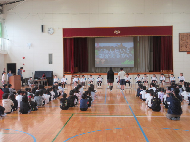本日1限目、体育館にて一年生を迎える会を行いました。6年生の係の児童からは1年生に向けて小山田小学校の紹介、行事の説明などの話がありました。