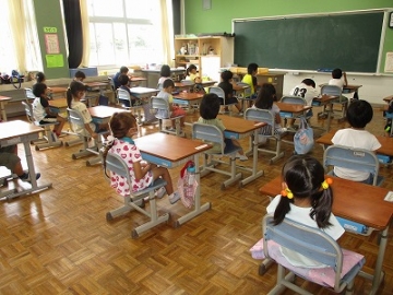聞くことに集中させるために、「校長先生は何色の服を着ているでしょうか」など問題を出しながら話をしました。教室からは「黒」「白」などの声が聞こえてきました。