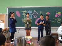 みんなで作ったさつまいもを、PTAの方に調理していただき、縦割り班で集まっていただきました。