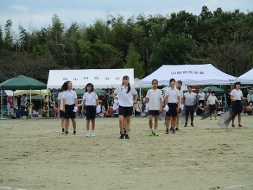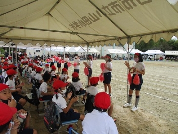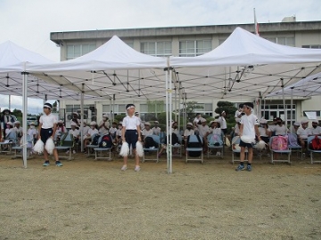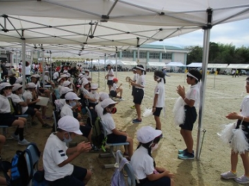 運動会前日(9月25日)は、雨の中、PTAの方にも協力していただきテント設営等の準備を行いました。 運動会当日(9月26日)の早朝から、職員やPTAの方と、少し水たまりの残る運動場を整備しました。また、地元の業者の方の好意により、トラックで土を運んできていただき運動場の整備に使わせていただきました。交通安全協会の方には駐車場の運営、地域の方やシルバー人材センタの方には、事前に剪定や草刈りをしていただきました。本当にありがとうございます。 応援合戦は、今年だけは声を大きく出さずに手拍子等で応援でした。   また、開会式ではPTA主催の「ぬりえコンクール」の表彰を行いました。作品については、学校公開日(10月2日)に掲示し、おうちの方に見てもらいました。 子どもたちは、感謝の気持ちを抱いて素敵な演技を披露してくれました。短い練習期間でしたが、徒競走、学年団体種目、表現など本当に素敵な姿を見せてくれました。    特に、圧巻だったのは、高学年の取り組みでした。本当に素敵でした。この運動会での成果を今後の教育活動につなげていきたいと考えています。      |
