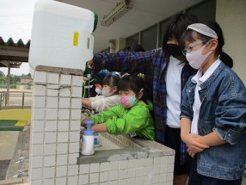 【1,6年生】給水タンクによる手洗い練習