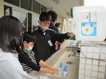 4月28日、雨のため遠足が30日に延期となりました。遠足先の公園で、感染予防と災害時等を踏まえて、各学年にある給水タンクを使って手洗いを行う予定でしたが、雨のため、学校内で行いました。当日は、6年生が1年生に対して、せっけんを使っての手洗いの仕方をやさしく教えていました。