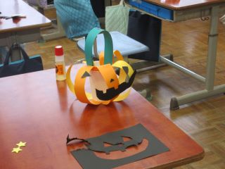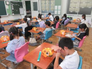 今日は、どの学年も運動会の練習は一休みです。1年生では、図工科の学習で、ハロウィンの飾りを紙コップと画用紙で作っていました。「校長先生、見て!これ、コウモリとおばけ!」と言いながら、黒の画用紙で、形を上手に切り取っている子がいました。たくさんのステキな「ジャック・オー・ランタン」が出来上がっていました。