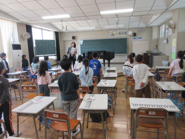 2年生は音楽室にて「にんげんっていいな」を歌いました。リズムに合わせて体を左右に振りながら楽しく歌う子どもたちの姿が見られました。