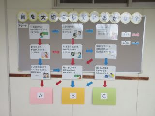 また、「目」の大切さについての掲示もあります。秋の夜長に読書に親しむ人もいると思いますが、目の使い過ぎにならないように意識できるといいですね。