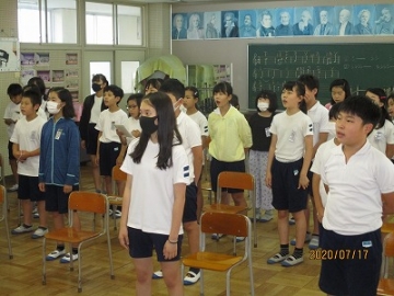 新型コロナウイルスの関係で、運動会の時に、校歌が大きな声で歌えないことや校歌の練習する時間を省くことなどを目的に、6年生が校歌を録音し、運動会当日はそれに合わせて歌うことにしました。気になる子どもは、マスクをしたままで歌いました。6年生は緊張もせず、2回チャレンジしただけで、きれいな歌声を録音しました。さすが6年生。