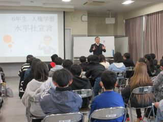 水平社宣言の精神で大切にしたいこと「人としての誇り」「団結する」「人を尊敬する」ことは、今の時代でも、とても大切なことです。2か月後は、西陵中学校でともに学習する仲間となります。今日教えていただいたこと、学んだことを、中学校に進学してから「いじめや差別を許さない仲間」となるように行動に表していってほしいです。