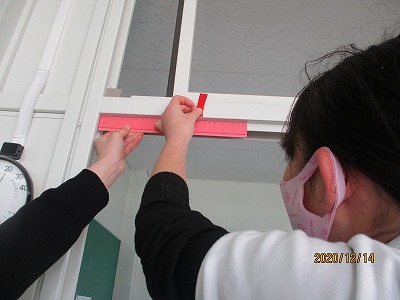 健康清掃委員会では、冬を健康に過ごす為にできることとして、授業中の換気の目印を「換気ライン」とし、各教室に赤のテープで20㎝の印をつけにいく(ここまでは必ず開けてね)という活動を行いました。