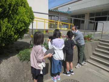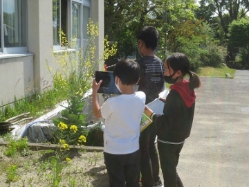 理科の学習で、春さがしをしました。自分のタブレットを使って、春の生き物の様子を撮影しました。咲いている花の名前を先生に聞いたり、空を見上げて虫を探したりと興味津々な様子でした。教室に戻ってからは、画像のトリミング作業をしました。
