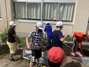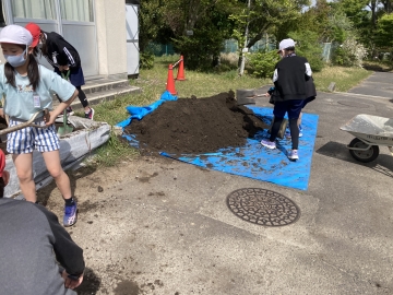 昨日,シートの張替えを行うために,子どもたちといっしょに土を出しました。2つのグループに分かれて行ったのですが,一人ひとりが手を止めず一生懸命作業をしていました。