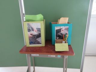 児童昇降口に、1学期末に環境委員会が募集していた、カメの名前の応募箱が設置されています。名前のない2匹の特徴がよくわかるように写真付きの箱になっていました。