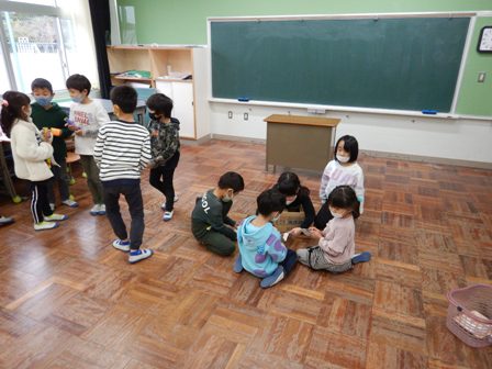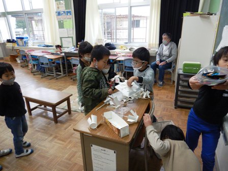 12月3日(木)5限目,2年生が自分たちでおもちゃを作って遊ぶ単元「ワクワクランド」が完成したので,1年生をお招きしました。
