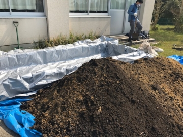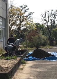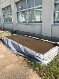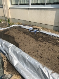 まず、学習園が水田になるように、学習園の土を全て出して、シルバーシート(水が漏れないような頑丈なシート)を敷きました。