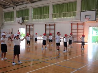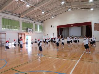 今日の2限目は、1・2年生が体育館で運動会の練習をしていました。練習前には、ラジオ体操で準備運動、音源の不調で、小さな音しか聞こえませんでしたが、子ども達はよく覚えていてしっかりと体を動かしていました。