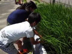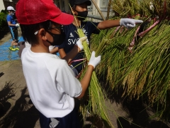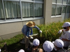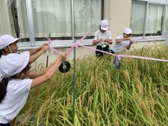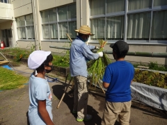 9月8日(火)稲刈りをしました。地域の須藤さんに助けていただき,稲刈りをしたあとにビニールで稲を束ねて干しました。子どもたちから,「楽しい!もっとやりたい」という声が挙がったので,昔はこの何十倍もの面積で,腰を下ろさずにやっていたことを伝えると,その大変さを改めて感じていました。しばらく天日干しにしたいのですが,この先1週間天気が悪そうなので,雨の日は校舎の中に入れたいと思います。来週は脱穀をしたいと思います!!