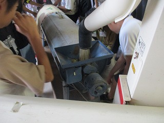 田植えから収穫、脱穀まで行ってきたお米を、今回はもみすりしました。機械で素早くもみ殻を取り除き、不揃いな玄米ときれいな玄米を分ける仕組みを、地域の方に協力していただきながら見学しました。