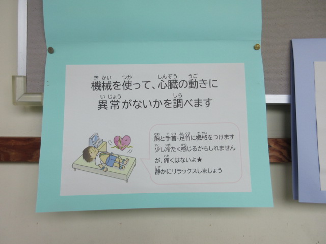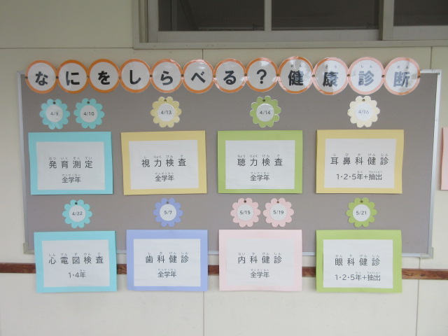 保健室の廊下側に健康診断に関する掲示物があります。いつ、何の健診があるか分かるようにしてあります。