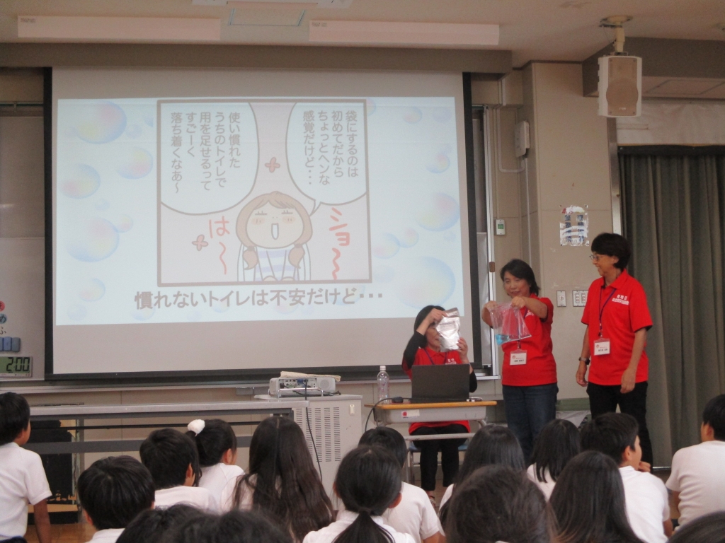 桜地区の防災隊「桜ずきんちゃん」を講師に迎えて、4年生が簡易トイレ体験などの学習をしました。