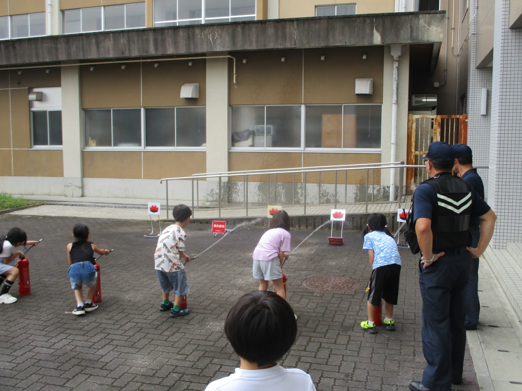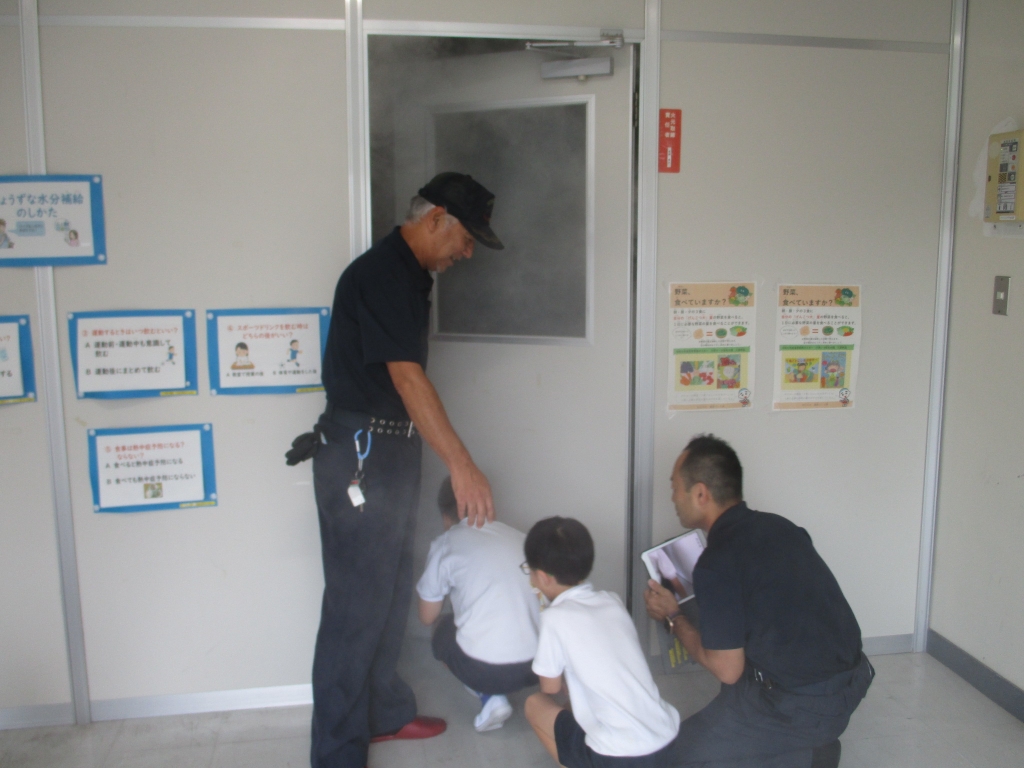 火事の原因や、火事が起きた時の対応の仕方を学んだあと、水消火器を使ったり、煙体験をしたりしました。