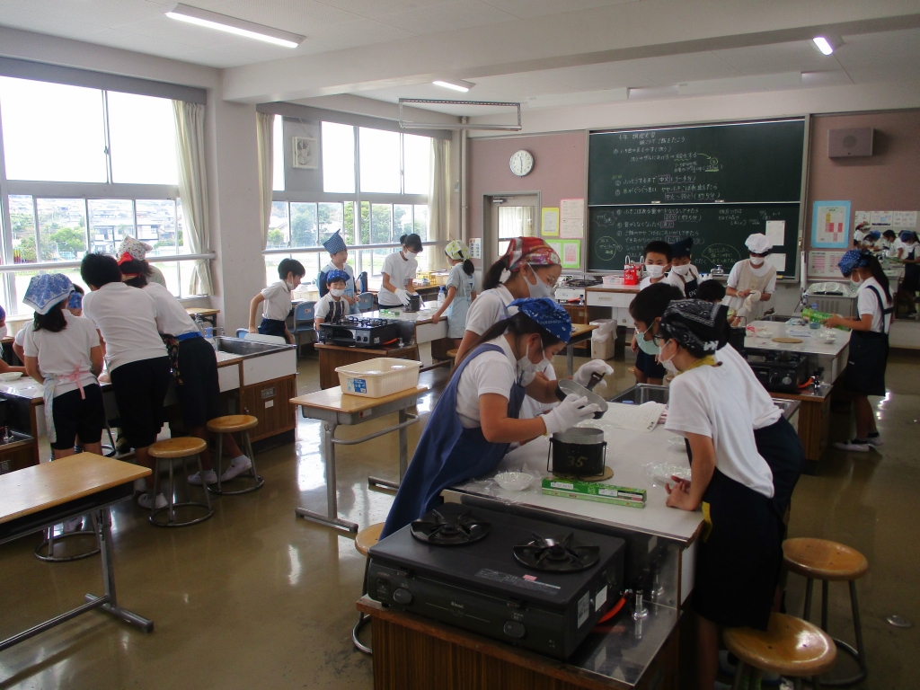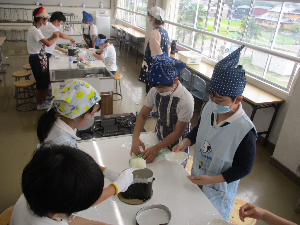 3日、家庭科室のガスコンロを使い、飯ごうでご飯を炊きました。ふっくらとおいしく炊きあがったご飯でおにぎりを作りました。