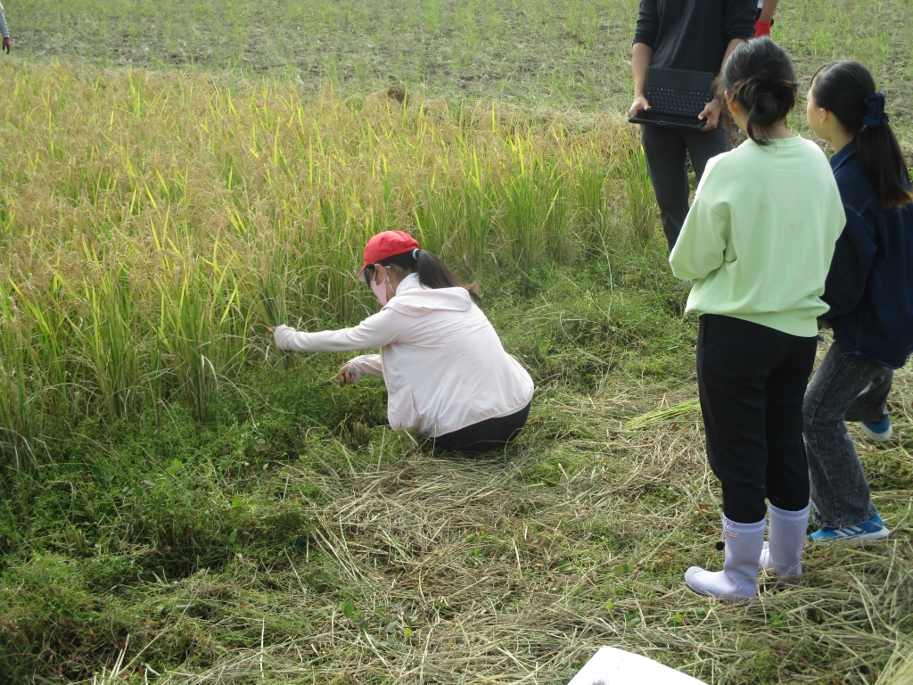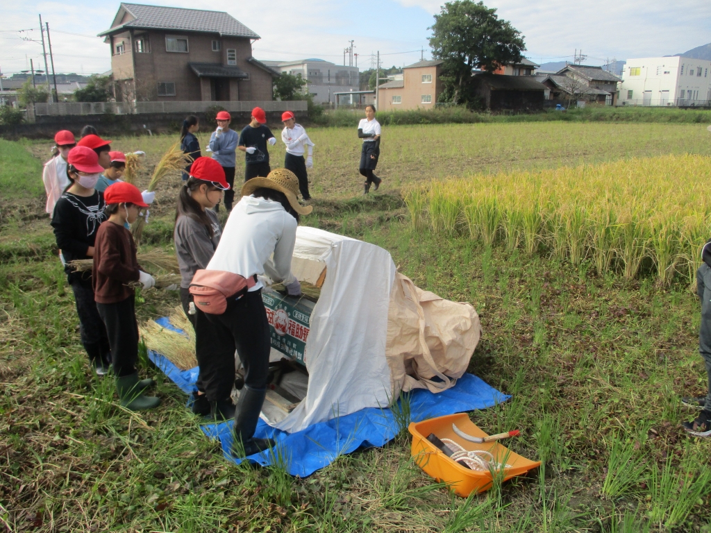 一学期に田植えをした稲が大きく実ったので、稲刈り体験をしました。講師の鈴木さんの説明を聞いたのち、鎌で稲を刈りました。また、その稲を足ふみ脱穀機を使って脱穀しました。