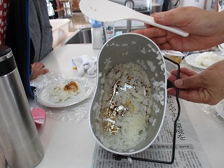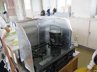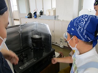 テーマは「飯ごうでご飯を炊こう」です。自然」教室にむけて、ガスコンロでお米を炊いてみます。