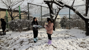子どもたちは学校に着くと運動場に出て雪を丸めていました。