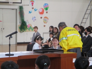 四日市西地区交通安全協会の山口様からランドセルカバーを贈呈していただきました。交通安全には十分気を付けてほしいと思います。