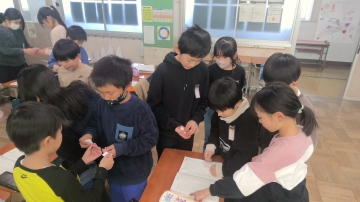 3年生は昨日、点字について教えてもらいました。さっそく点字カードを友だちと交換し、何と書いてあるか調べていました。