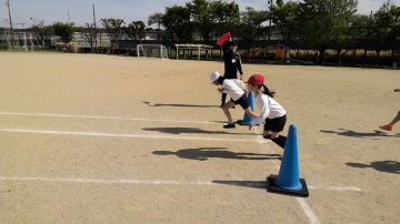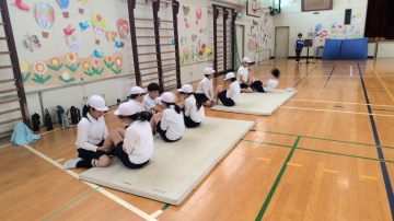 1年生と6年生が体育をしていました。玉入れをしたり、蛇じゃんけんをしたりしてからだをほぐしていました。