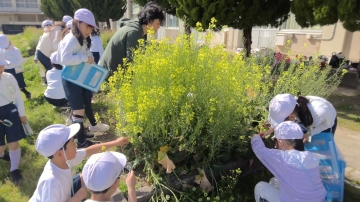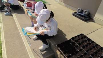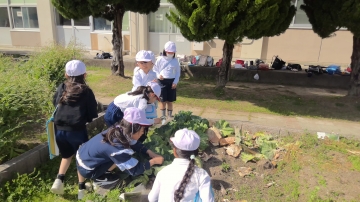 3年生はルーペを持って学級園の周りに集まっていました。キャベツや菜の花を一生懸命のぞいています。モンシロチョウの小さな小さな卵を見つけてカードに描いていました。