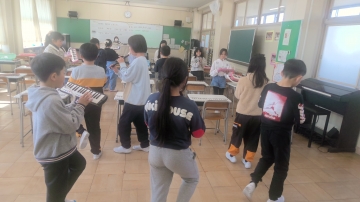 3年生は音楽でミッキーマウスマーチを笛と鍵盤ハーモニカで奏でていました。音楽室内を行進しながらリズムよく楽しんでいました。