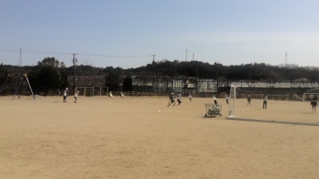 5年生は体育で「つながりキックベースボール」でした。ボールを蹴った子が塁に進むのが速いかボールを捕りみんなが集まるのが速いか競争していました。