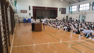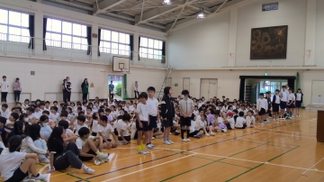 つづいて認証式です。各クラスの代表委員が一人ずつがんばることを発表しました。「あいさつをもっとできるように」「廊下の歩き方を気を付ける」「みんなが楽しい学校にする」など力強いメッセージを伝えました。