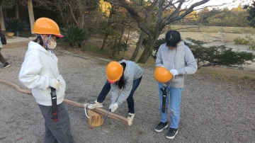 運んできた木を薪の大きさにそろえて切ります。来年度のキャンプファイヤーに使ってもらえるかな