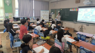 社会の勉強です。お店の工夫を見つけていました。今度、一号館に見学に行く予定です。見学の視点を確かめました。