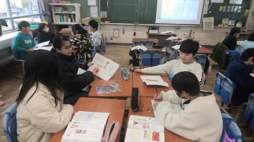 4年1組は国語科です。2種類のチラシについてデザインや見やすさ、わかりやすさなどのを視点に比較し、それぞれの良さを交流し合いました。わかりやすい作文を書くための学びです。課題やめあて、指示がはっきりしているため、最後まで集中して考えることができました。