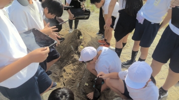 同じ時間、運動場の砂場では、5年生が、理科『流れる水の働き』について実験をしていました。「曲がるところの内側に石がたまる」など見た事実を話していました。教室に戻り、撮影していた映像をもう一度見て、学習するそうです。