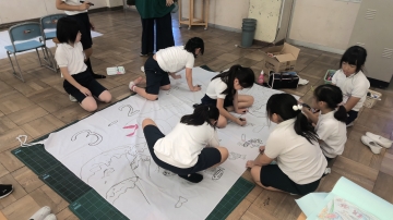 今週に入り、どの学年も集中して運動会リズム、徒競走の練習に取り組んでいます。今日校内をまわっていて目にしたのは、3,4年生がソーラン節で使う『大漁旗』の製作をしている様子でした。クラス全員で図案を考え、まとめあげ、いよいよ白布に下書きに入ったようです。本番には、大きくなびく大漁旗を披露します。