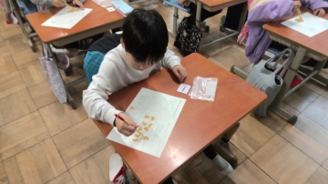 小さな硬いマカロニを箸でつまんで、小さな枠に上手に移すことができました。