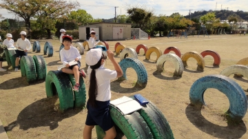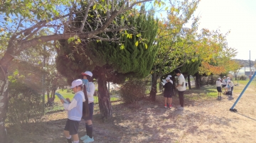 3年生が外で理科の勉強です。遮光版を使って太陽と影の位置を観察していました。
