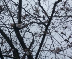 春霞(はるがすみ:大気中(たいきちゅう)の水蒸気(すいじょうき)やホコリ、花粉(かふん)などで白(しろ)っぽくかすむこと。)でしょうか。花粉症(かふんしょう)の人には、つらい時(とき)だと思いますが、集中する時は集中してなんとか乗(の)り切(き)ってほしいと思います。