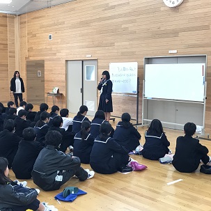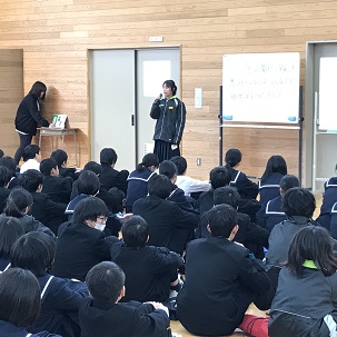 各クラス代表の生徒に福祉体験学習の1分間スピーチをしてもらい、活動のふりかえりをしました。