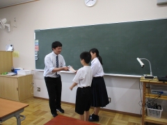 3週間の教育実習が、本日で終わりました。1年生では、杉本さんが4組で実習をしました。1年生の生徒には、国語の授業で教わったことを、これからの授業や家庭学習に活かしていってほしいです。また、4組の生徒にとっては、授業以外にも学活や清掃、昼食時の交流等を通して、学校生活全般に関わることを指導してもらいました。3週間という短い期間でしたが、杉本実習生と生徒が強い絆で結ばれていました。杉本さんの今後の活躍を期待しています。