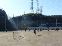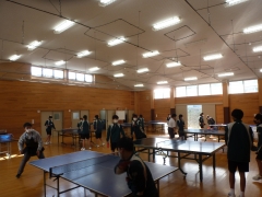 各学年の体育科の授業の様子です。3年生は体育館でバドミントン、2年生は運動場でテニス、1年生は武道場で卓球の授業です。